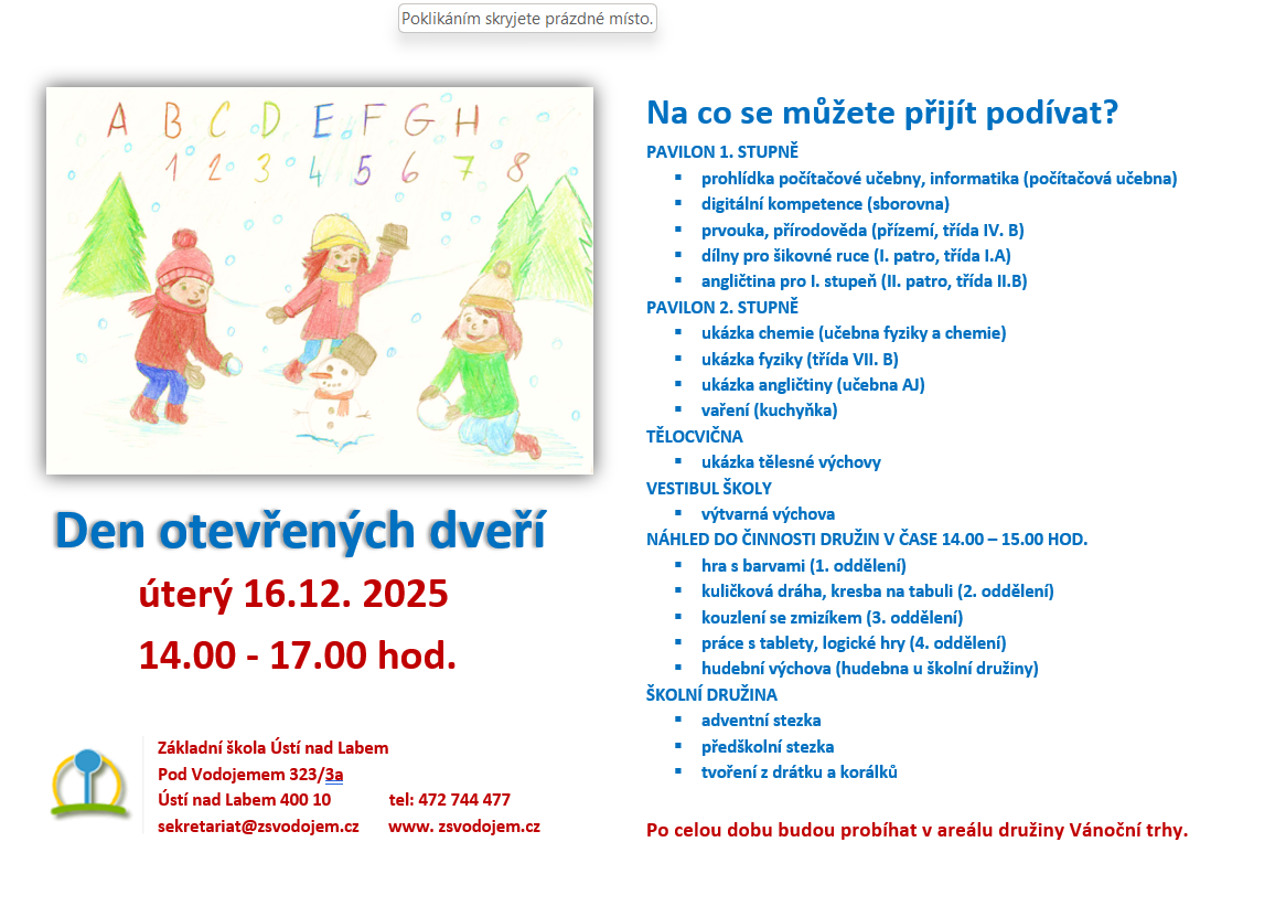 v úterý 16. 12. 2025 se v naší škole od 14.00 do 17.00 hodin uskuteční den otevřených dveří. Přijďte se podívat, nasát atmosféru, která u nás panuje, seznamte se s pedagogy, nahlédněte do tříd 1. i 2. stupně, zavítejte do školní družiny, proběhněte se v tělocvičně. Zkrátka, přesvědčte se na vlastní oči, jaké to u nás je. V průběhu návštěvy můžete také utratit nějakou korunu na družinových Vánočních trzích.