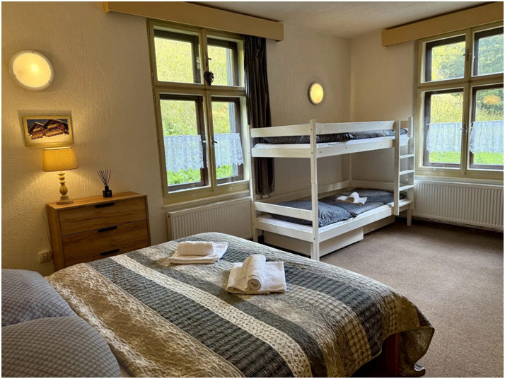 Dvou až šestilůžkové pokoje se sociálním zařízením na pokojích. K dispozici je společenská místnost. Zajištěna je plná penze s pitným režimem.