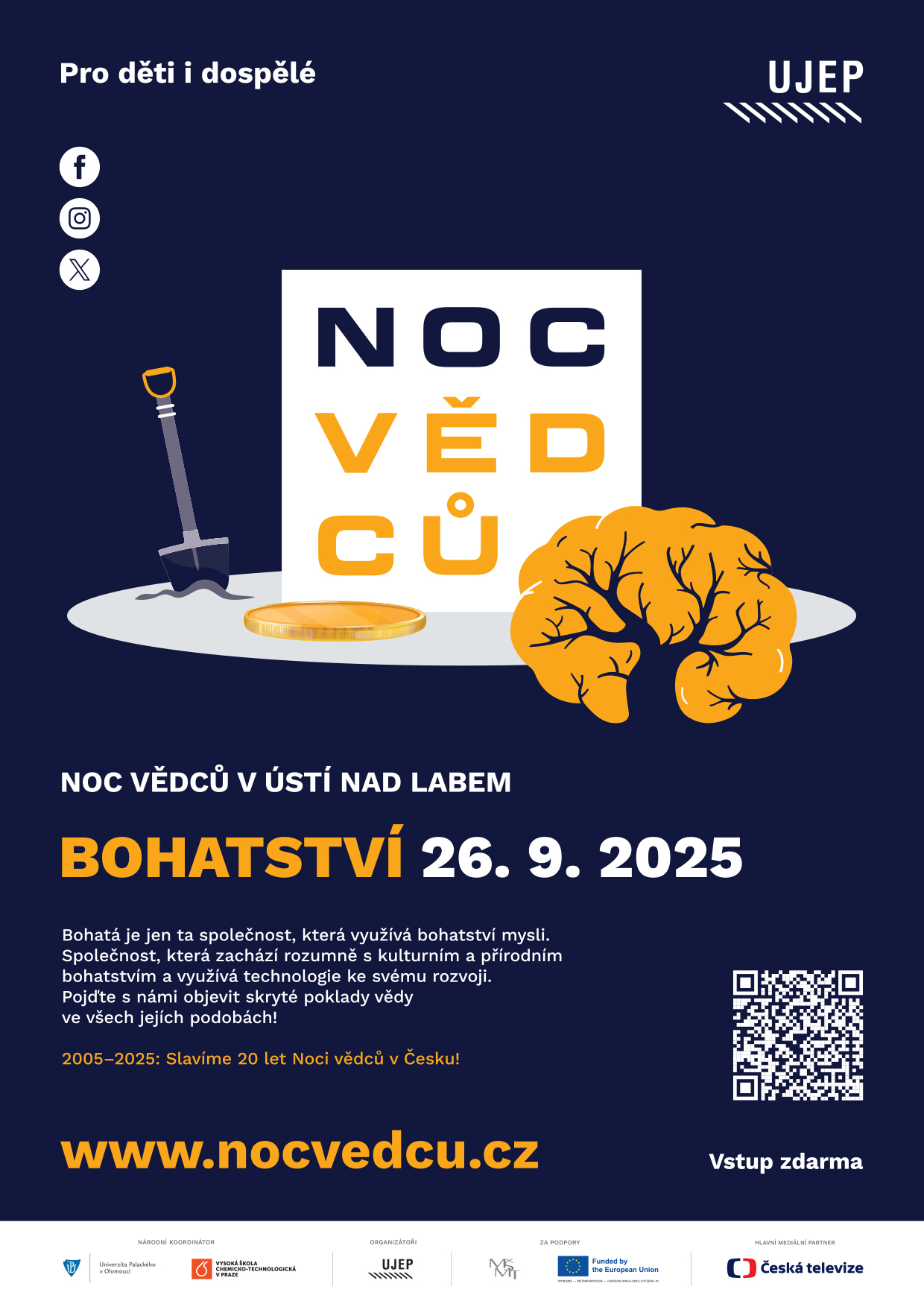 Téma letošního ročníku se zaměřuje na bohatství ve všech jeho podobách – od přírodních a kulturních až po to nejcennější: lidskou mysl a vědění. Věda je sama o sobě nesmírným bohatstvím, které obohacuje společnost, přináší nové poznatky a otevírá obzory. Připraveny jsou desítky stanovišť, experimentů i workshopů, které ukážou, že bohatství má tisíce tváří.