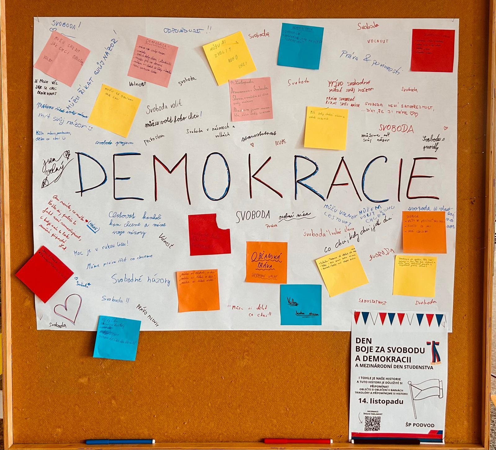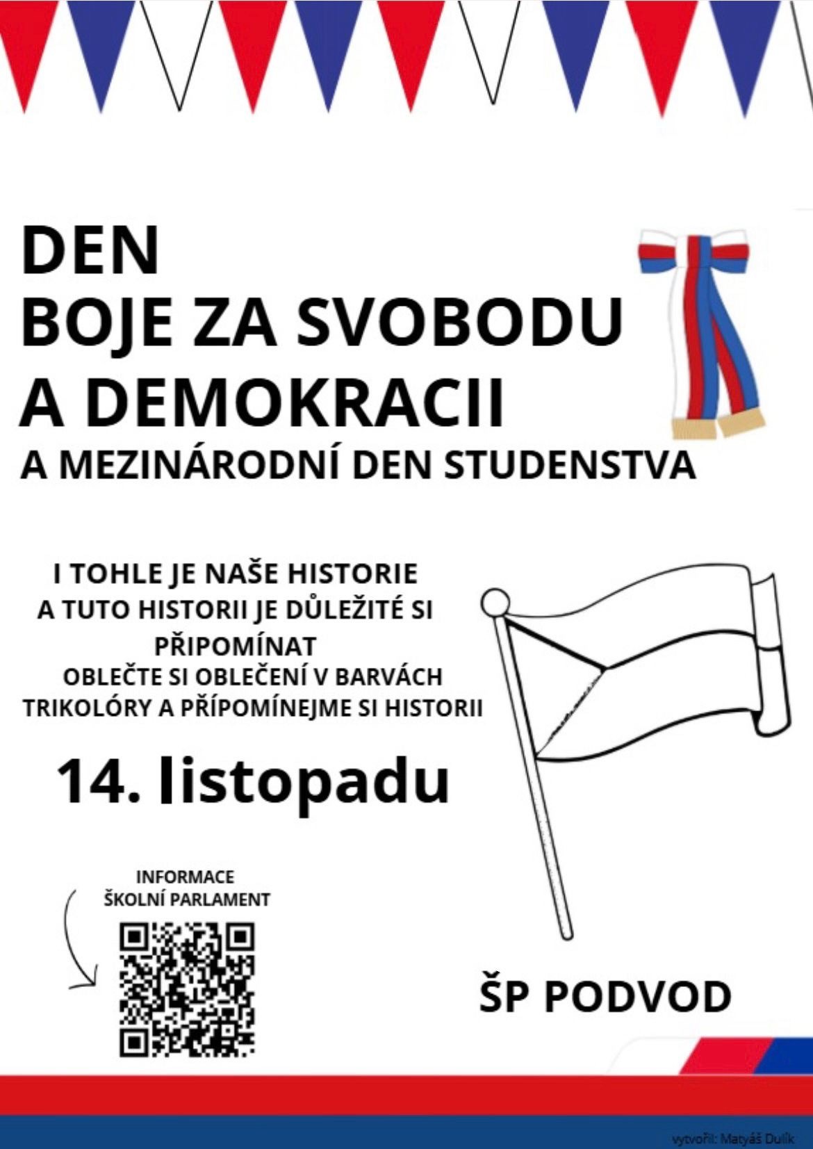 Výsledek už můžeš vidět a pocítit i ty sám. Školní parlament si pro připomenutí tohoto významného dne pro tebe připravil na pátek 14.11. Tříbarevný den. Přijď do školy v jakékoliv barvě trikolóry (nebo klidně ve všech) a pokud budeš chtít, v atriu školy můžeš vyjádřit svůj názor a napsat, co ti demokracie přináší…