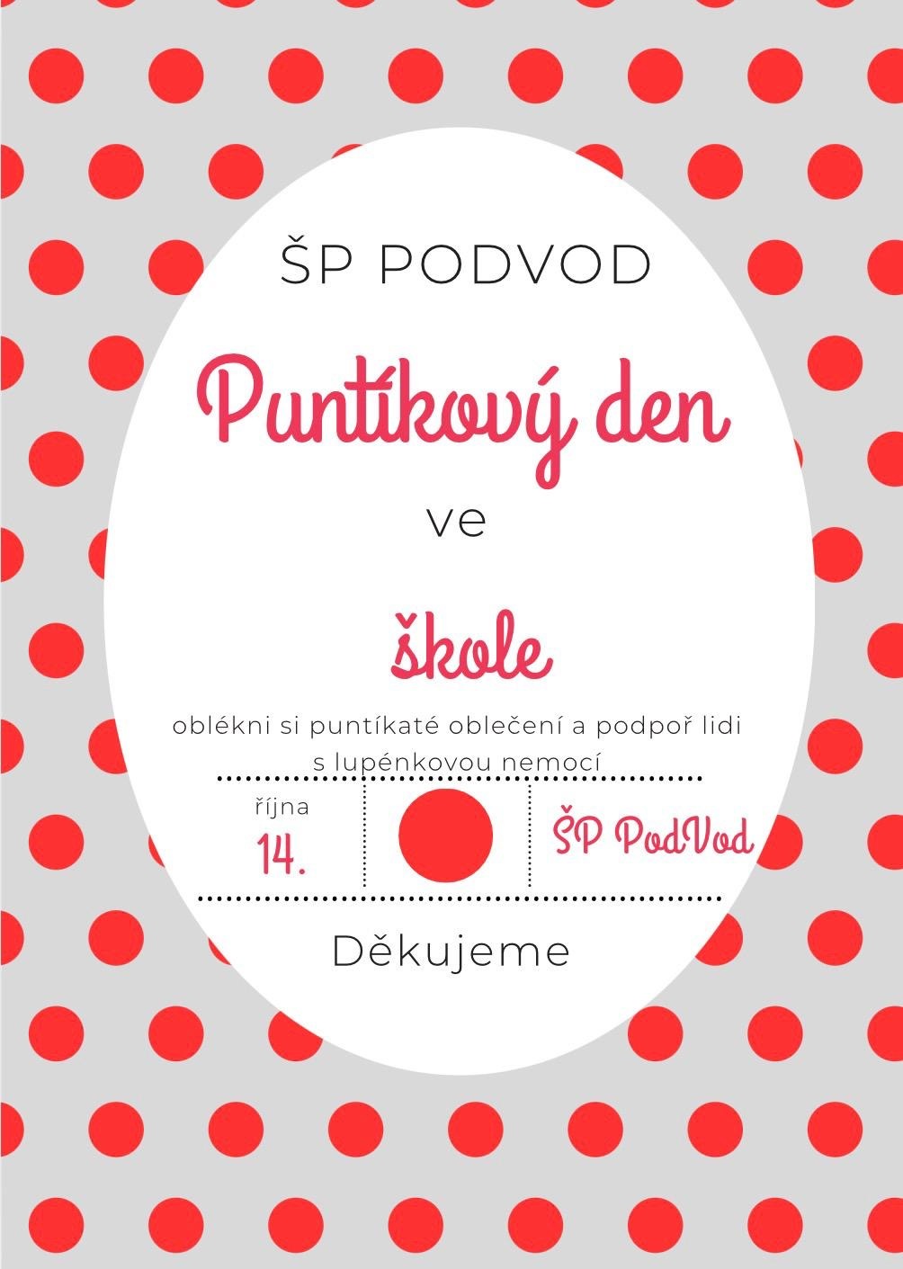 Školní parlament PodVod zve všechny žáky, pedagogy i nepedagogy, aby se připojili ke světovému dni psoriázy neboli lupénky, a to prostřednictvím Puntíkového dne. A jak můžeš přiložit ruku k dílu právě ty? Přijď s puntíkem do školy a proměň předsudky v pochopení. Bližší informace najdeš v přiloženém letáčku!